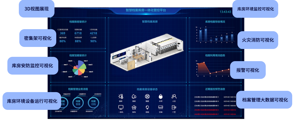 通過拼接大屏、液晶屏、導引屏等終端展示庫房環境數據、安防數據、消防數據、密集架與檔案數據、檔案利用數據、異常報警信息等。