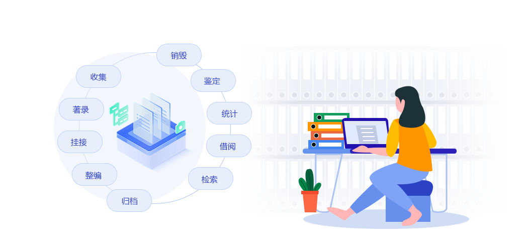 提供檔案從歸檔到長期保存全過程的規范化管理,涵蓋收集、整編、鑒定、保管、檢索、利用、編研、統計等檔案日常管理工作八大環節的全生命周期管理功能,為檔案管理、保存和利用賦能,確保檔案的真實、完整、安全、可用。